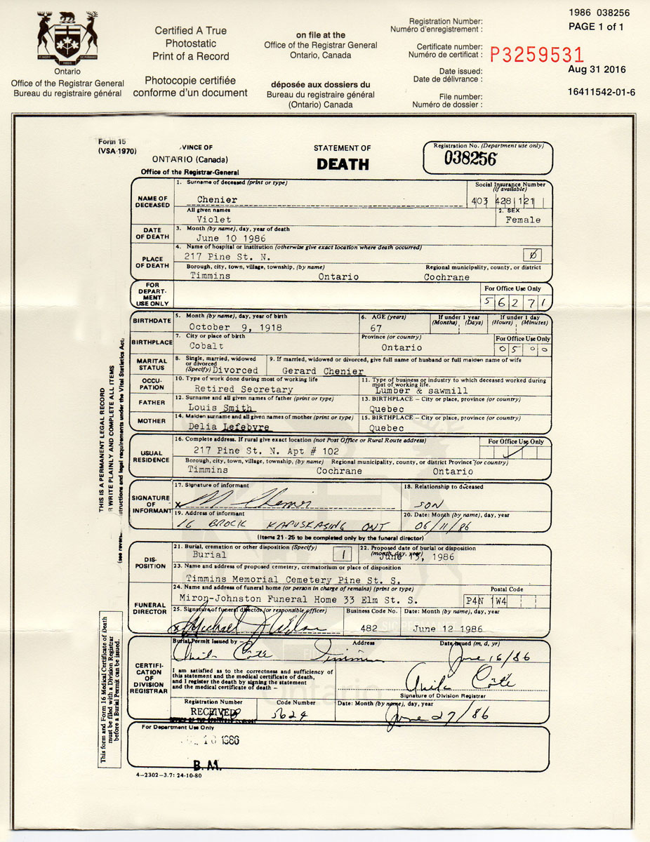 Copy of death certificate for Violet Ethel Smith (1918-1986)