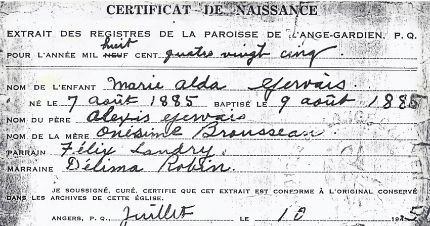 Extract of birth & baptism certificate for Marie Léda Alda Amanda Gervais