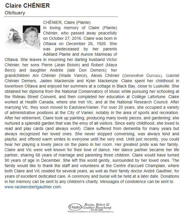 Chénier, Claire (Née Plante) (26 Dec 1926-27 Oct 2016)