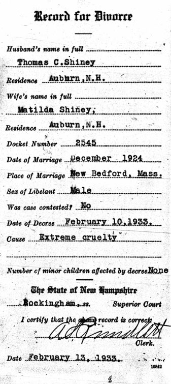 Divorce record of Thomas Christopher Shiney & Matilda Dumesnil