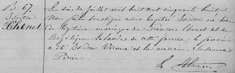 Isidore Chénier tel qu'il est écrit dans le registre de baptême