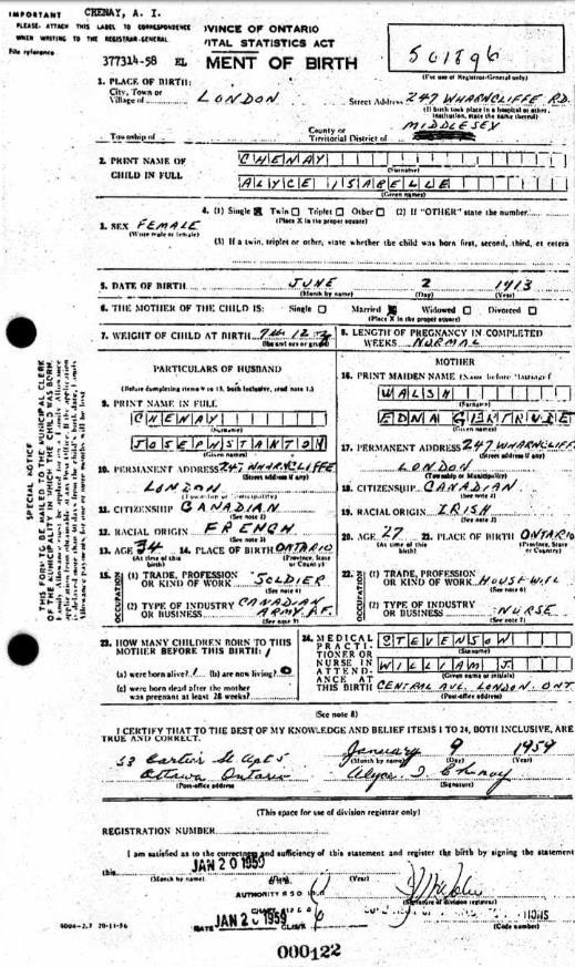 Birth record for Alyce Isabelle Chenay
