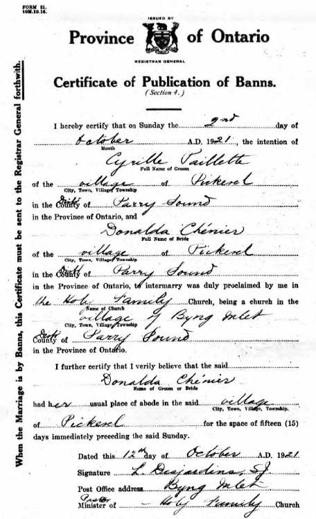 Marriage Contract between Cyrille Payette (Paillette) and Donalda Chénier