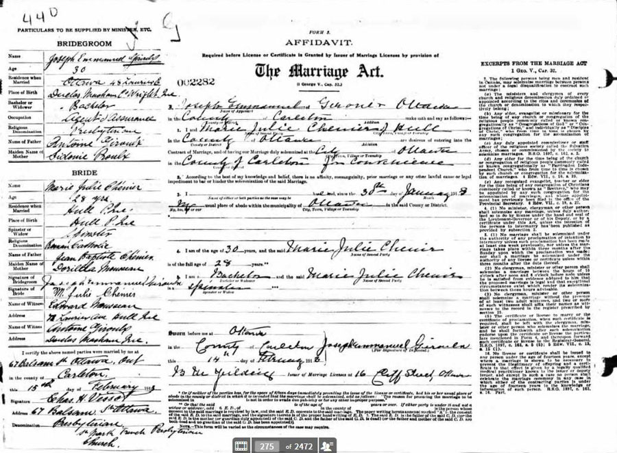First protestant marriage between Julie Chénier & Emmanuel Giroulx
