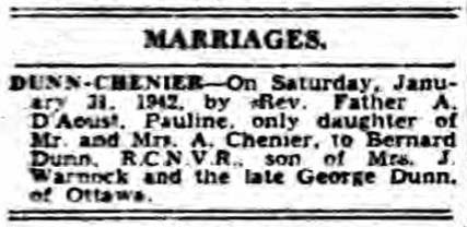 Marriage notice between Bernard Dunn & Pauline Chénier