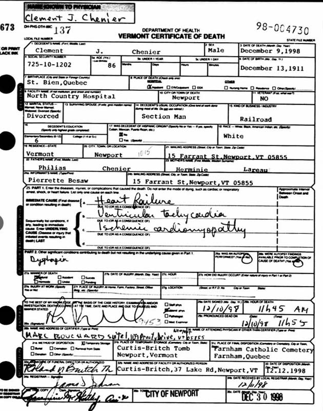 Death record for Clément (Cléophas) Chénier (1911-1998)