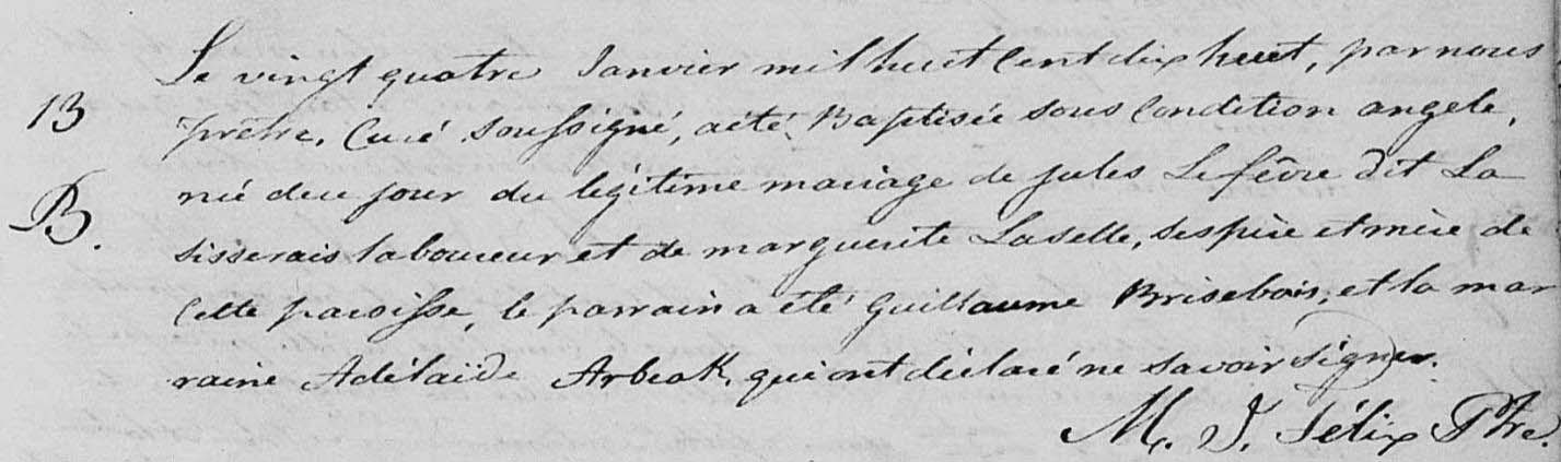 Record de naissance et baptême d'Angèle Lefebvre (dit Lasisserais)
