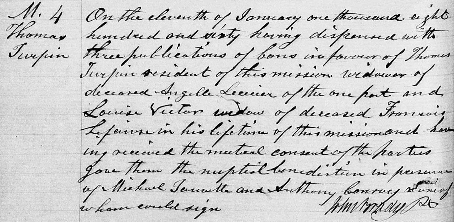 Marriage record between Thomas Turpin & Marie Louise Victor (Victor dit Couvrette/Couvrette dit Victor)