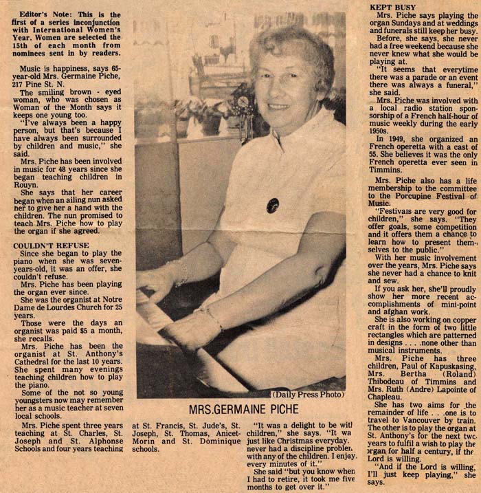 Germain Piché: Timmins Ontario Woman of the Year 1975