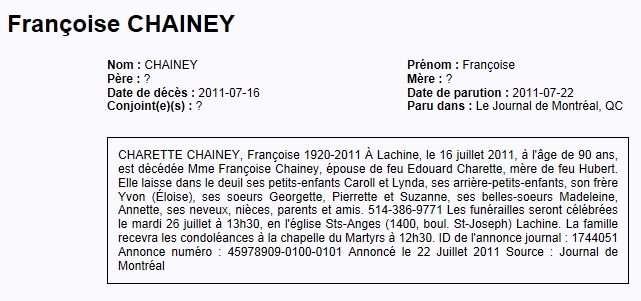 Charette Chainey, Françoise (Née Chainey) (1920-2011)
