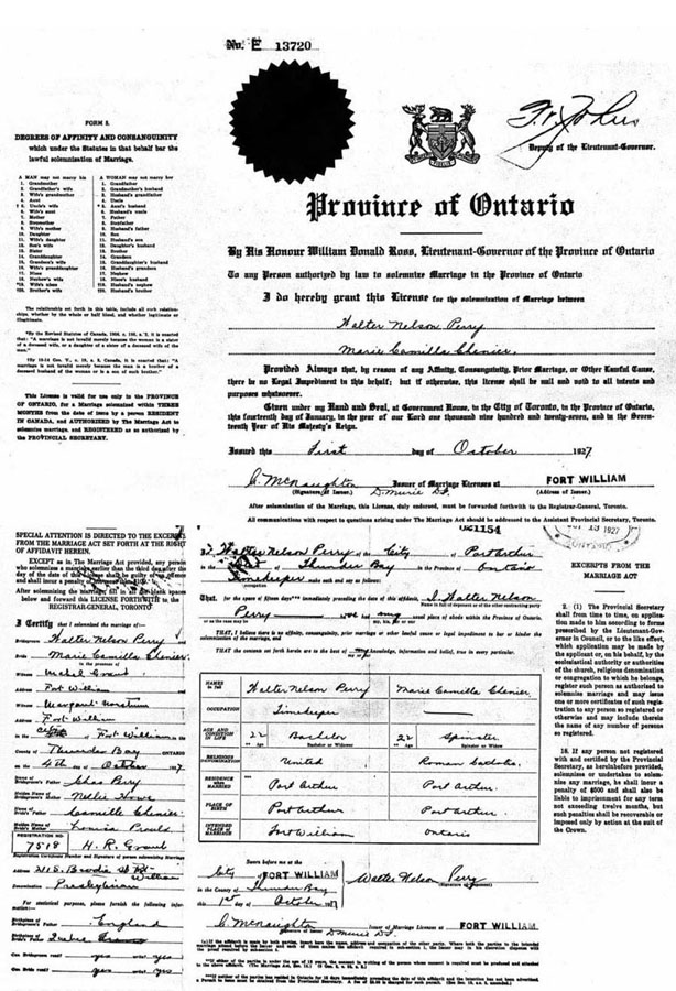 Civil marriage record between Marie Camilla Chénier and Walter Perry