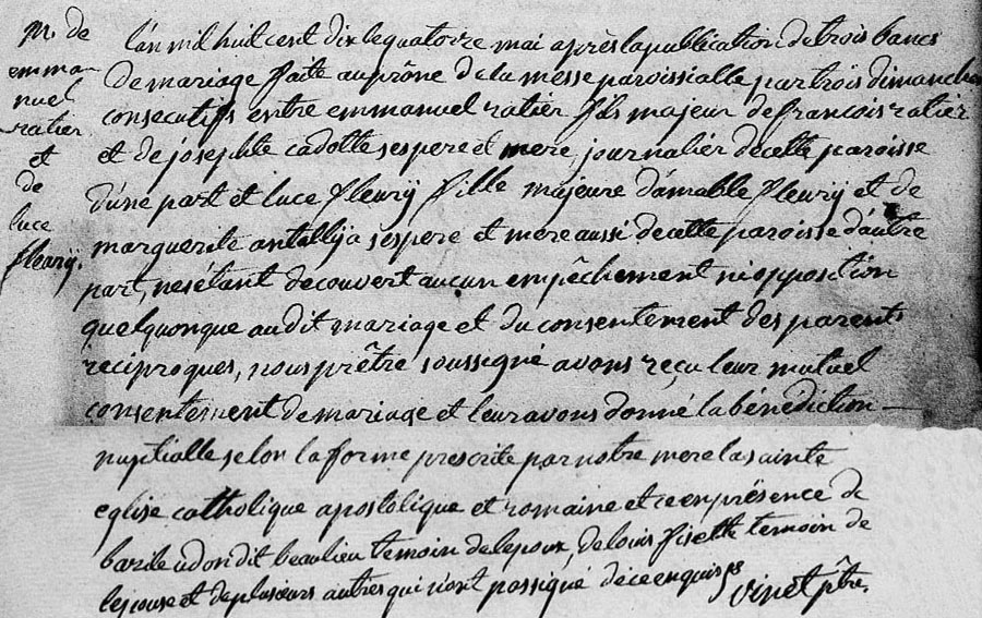 Marriage record between Emmanuel Rathier & Luce/Lucie Fleury