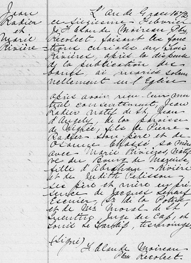 Marriage record between Jean Rathier/Radier Dit Dubuisson & Marie Rivière