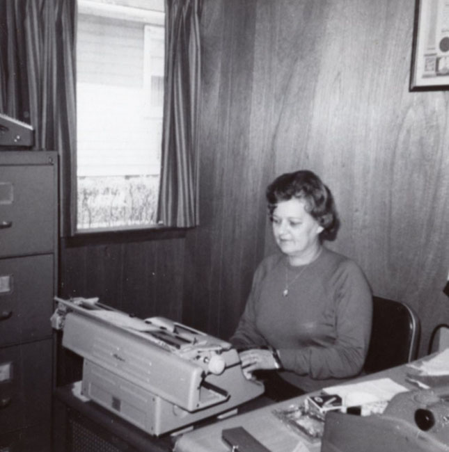 Violet working in her office at Lumber & Sawmill Workers Union 2995. Located at 20 Riverside Drive Kapuskasing ON. (circa 1960)