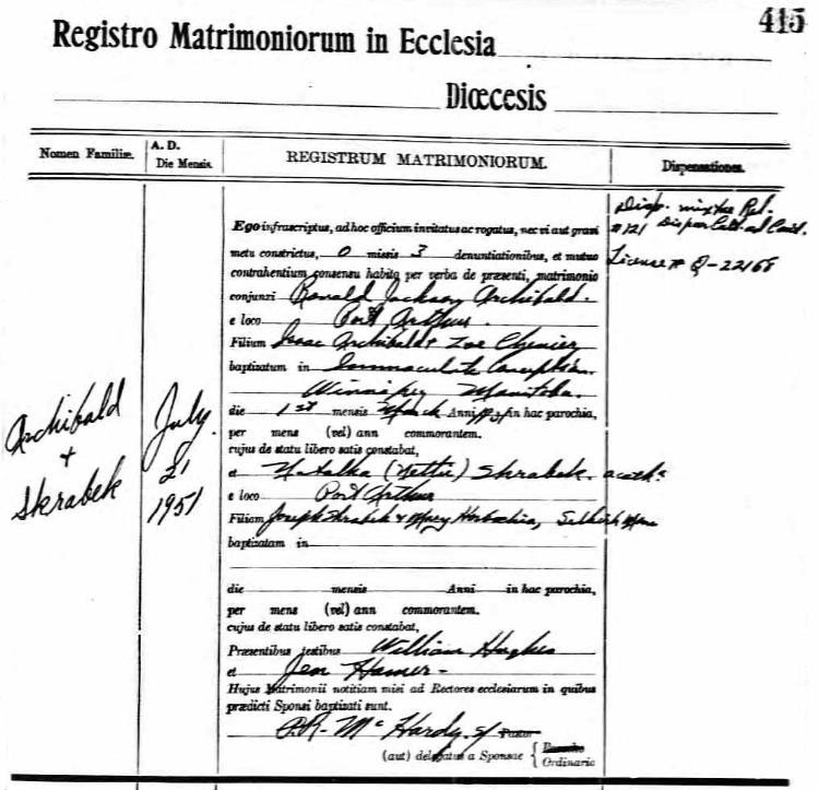Marriage record for Ronald Jackson Joseph Archibald and Natalka Skrabek