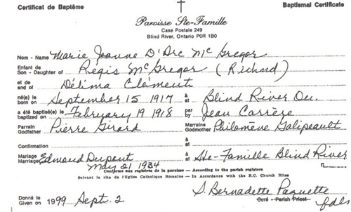 Jeanne D'Arc McGregor (Record de baptême)