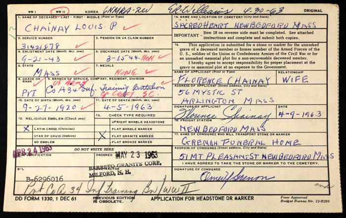 Louis Philippe Chainay tombstone request by his wife Florence Racine