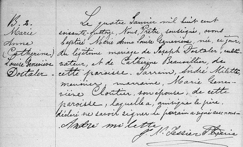 Baptism record for Marie Anne Catherine Louise Geneviève Dostaler