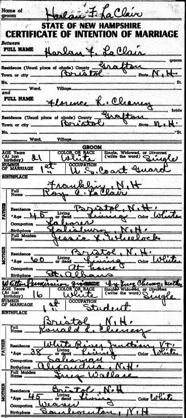 Marriage Intention between Florence Cheney and Harlan Laclair