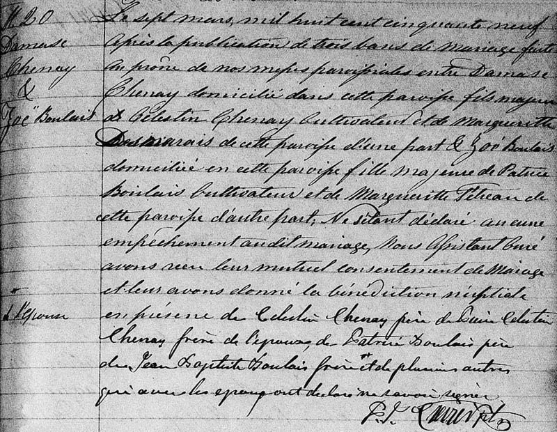 Marriage record between Damase Chenay and Zoé Boulais
