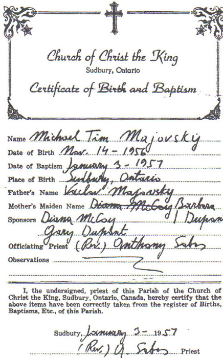 Michael Tim Majovsky birth & baptism record