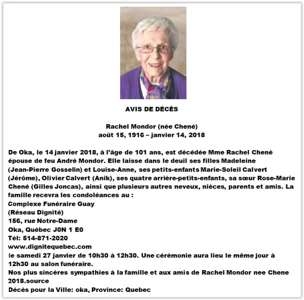 Mondor, Rachel (Née Chéné) (1916-2018)