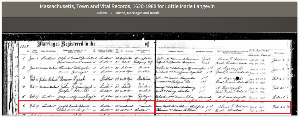 Emile Joseph Chenier & Lottie Marie Langevin Marriage Record