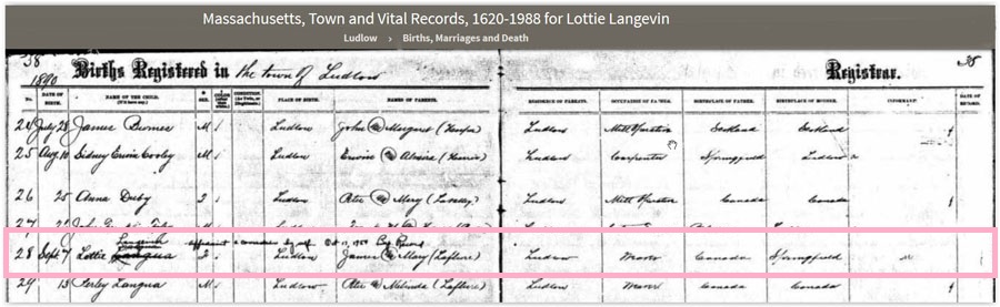 Birth record for Lottie Marie Langevin