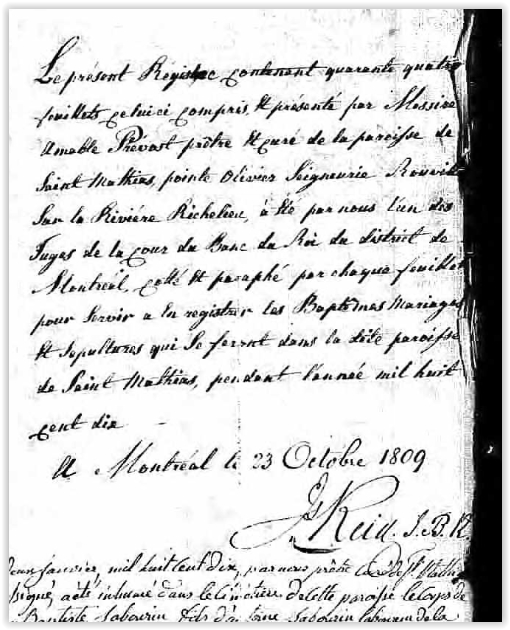 Page d'ouverture de la paroisse de St-Mathias pour les enregistrements de 1810 et non St-Hilaire