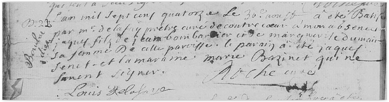 Baptism record for Jacques Bombardier