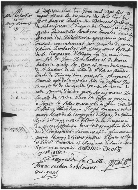 Marriage record between André Bombardier dit Labombarde ou Passepartout & Marguerite Demers