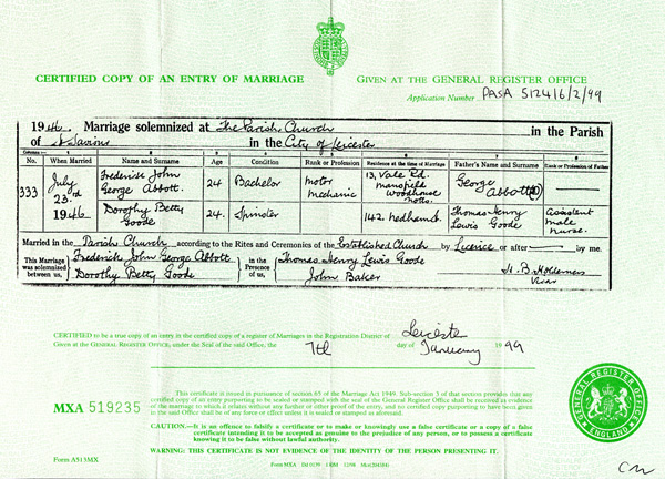Frederick John George Abbott and Dorothy Betty Goode marriage record