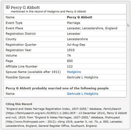 Marriage record between Percy George Abbott & Gertrude Louise Hodgkins