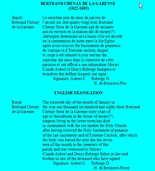 Transcription and Translation of Bertrand Chenay's Death & Burial Record