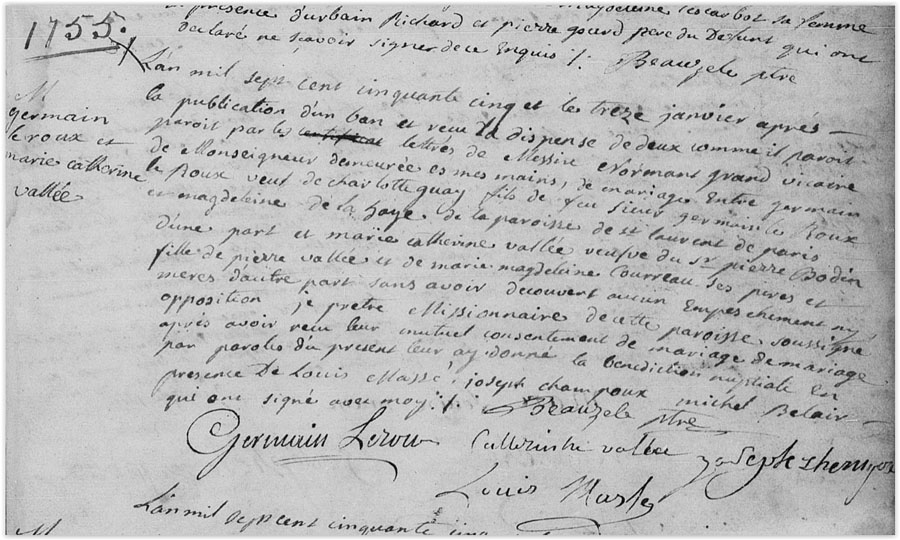 Marriage record between Germain Leroux & Marie Catherine Vallée