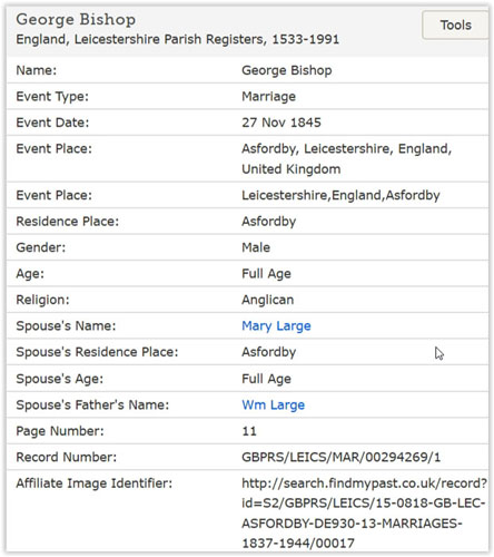 Record de mariage entre George Bishop et Mary Large