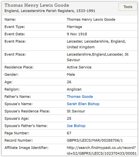 Record de mariage entre Thomas Henry Lewis Goode et Sarah Ellen Bishop