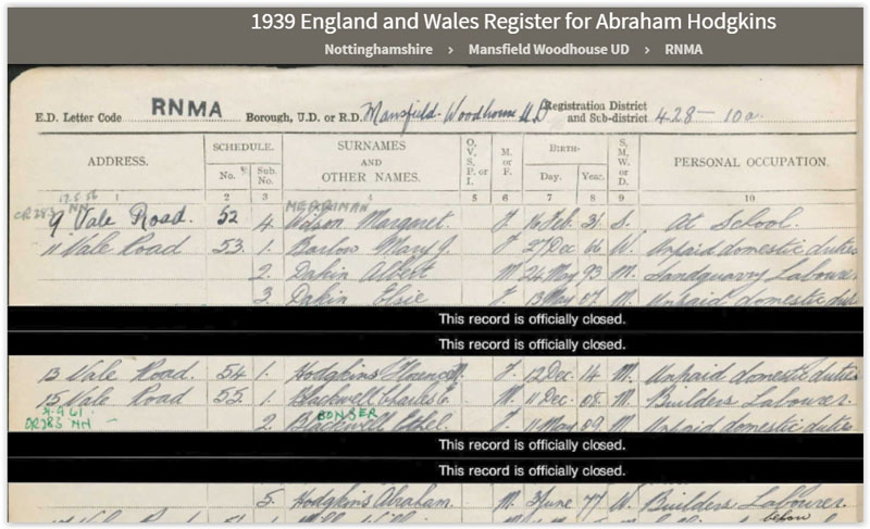1939 Nottinghamshire Census indicating Abraham Hodgkins date of birth