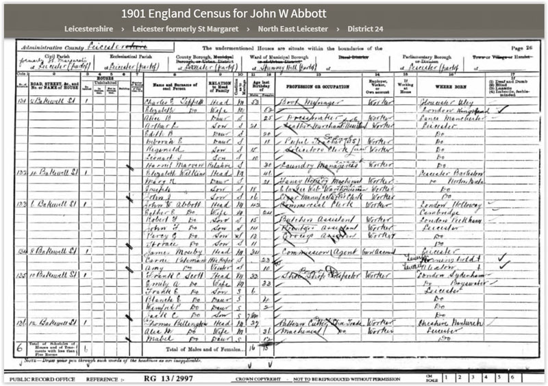 1901 Census of North East Leicester indication John William Abbott's approximate age