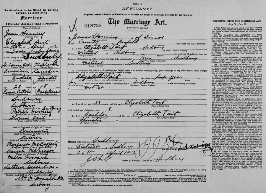 James Henning and Elizabeth Tait Marriage record as per Familysearh.org website
