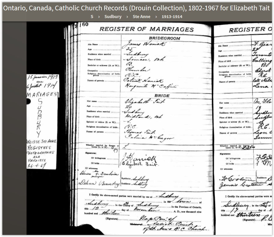 James Hanick and Elizabeth Tait Marriage record as per Ancestry.ca website