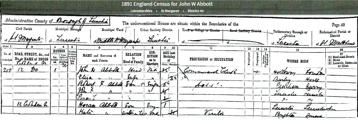 1891 England Census for Leicester (Percy George Abbott 2 years old at the time)