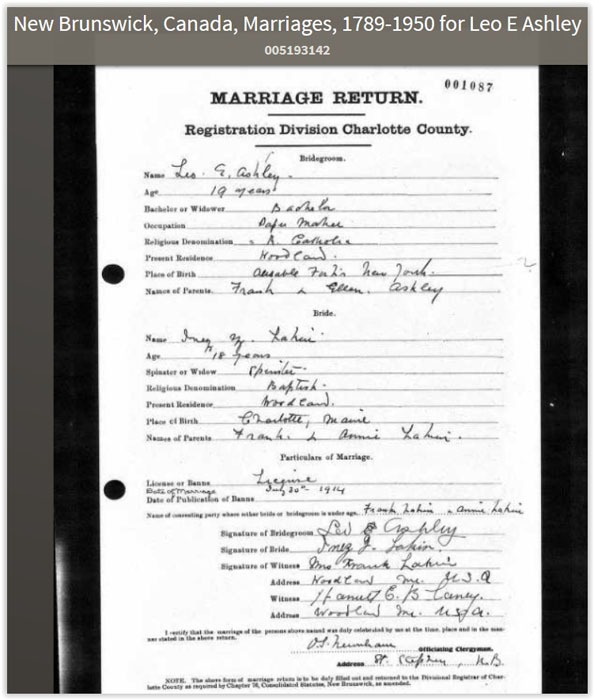 Marriage record between Leo Ashley and Inez Z. Lakin