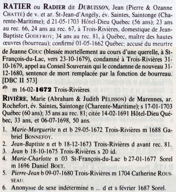 Family | Jean RATIER/RADIER DIT DUBUISSON b. circa 1641, d. 21 May 1703 |